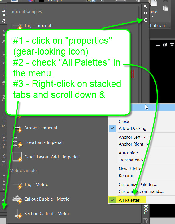 All of the palettes available from AutoCAD are now able to use and there are many useful tabs. In order to see all of the possible tabs, you need to right-click over the little area located at the bottom of the palette tabs. The little area of stacked tabs is where you need to right click. From there, you can simply scroll through and select the tab that you need. For the example of this blog post, select “Leaders” from the list.