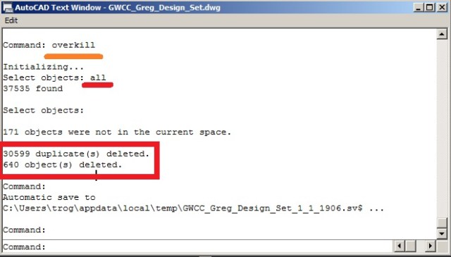 • After choosing your settings, click OK and wait. On the file that I cleaned up using OVERKILL, it took a couple of minutes because it was just that bad of a drawing…