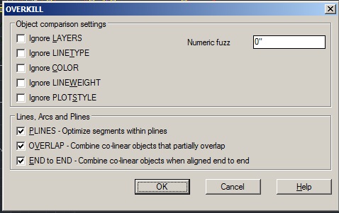 The upper portion called “Object Comparison Settings” are all unchecked by default. These are properties that if checked, Overkill will ignore. The “Numeric Fuxx” is the “Fuzz factor” and it is set to 0 (zero) by default. This looks for how closely objects are overlapped. So if you have two lines that look overlapped, but one is ever so slightly off – you can increase this “fuzz factor” and overkill will look for objects that are ever so slightly overlapped.
