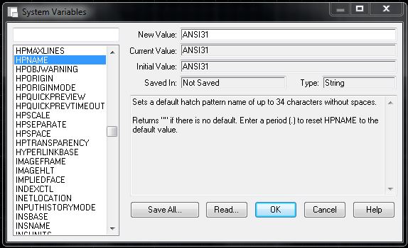 (setvar “HPNAME” “EnterHatchPatterNameHere”) ;Set “EnterHatchPatterNameHere” as the default hatch pattern (Not Saved)