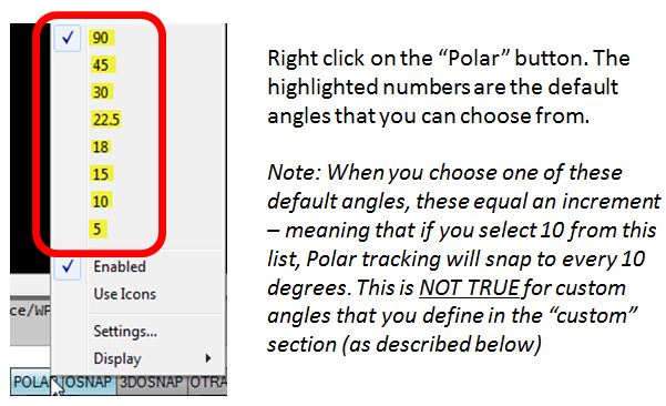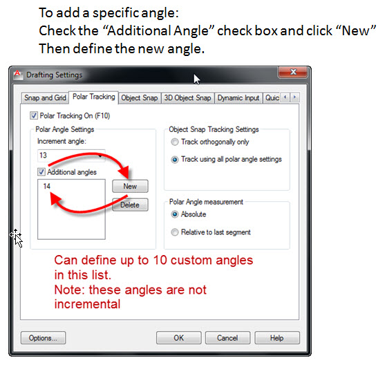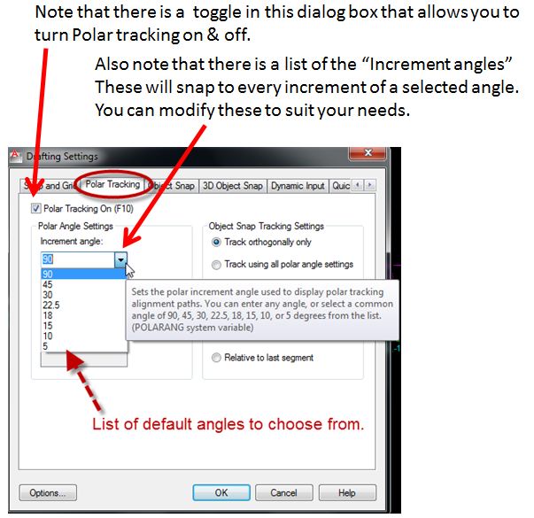 For “Polar Angle Measurement”, I check the “Relative to Last Segment” radio button because when you start the LINE command, for example, and start drawing or snap to another object, the Polar action uses the entity you just drew/snapped to as a base to work from. This works great when laying out watermains and you have to take bend fittings into consideration.