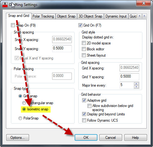 To turn on the Isometric mode, Right click on the “SNAP” button that is in the Drafting Settings buttons.