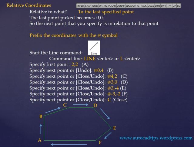 The way that you tell AutoCAD that you want to use relative coordinates is that you prefix the coordinate with the @ symbol. Note that the first point that is specified is an absolute coordinate since there is not a specified previous point.