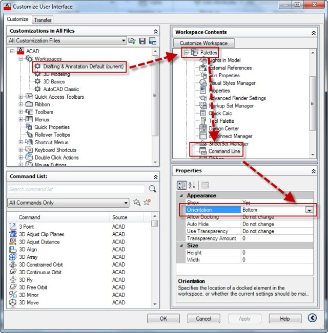 - Then under the “Properties” click the flyout next to “Orientation” and select where you want the position of the command line to be.